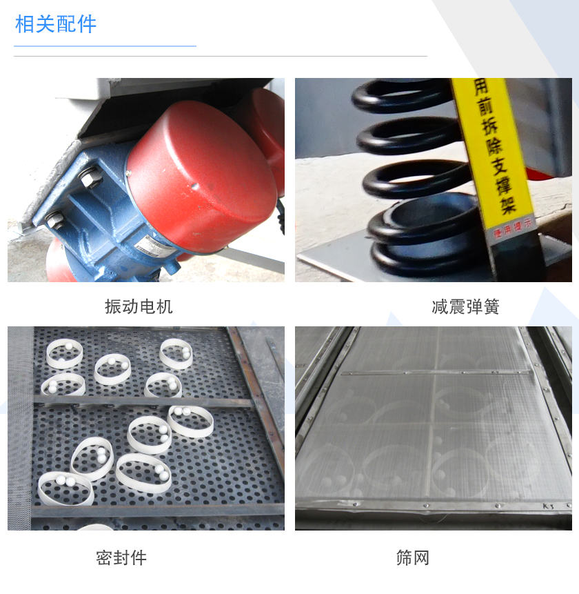 直線振動篩的配件包含:振動電機、減震彈簧、密封件、篩網、清網裝置,振動電機作為一臺篩分設備的動力源其優劣直接關系到設備的產量與使用壽命,篩網的選用也應該注重篩網的絲經、材質,選擇不同配置的設備,其價格會有所影響。