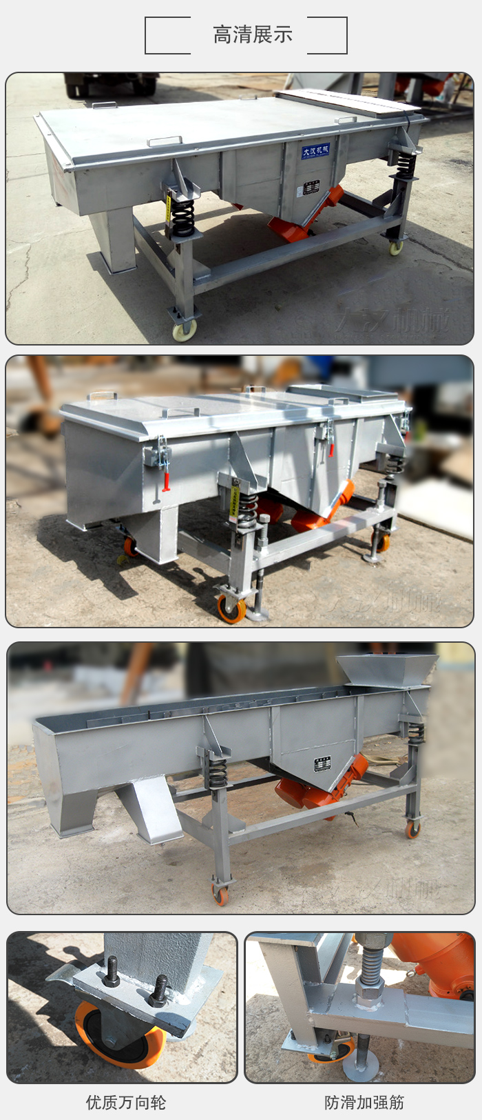 產品摘要:可移動直線篩又叫做可移動式直線篩,支腿加萬向輪及支架,可自由移動可隨意升降,方便客戶根據現場需要隨時調節。