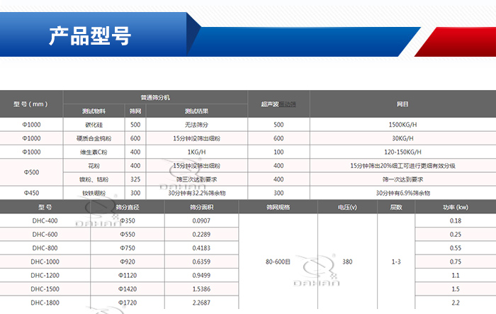 超聲波振動篩的常規型號有DHC-400、DHC-600、DHC-800、DHC-1000、DHC-1200、DHC-1500、DHC-1800、DHC-2000等,同時大漢機械支持產品特殊定做,根據您的要求為您定制出合適的設備!